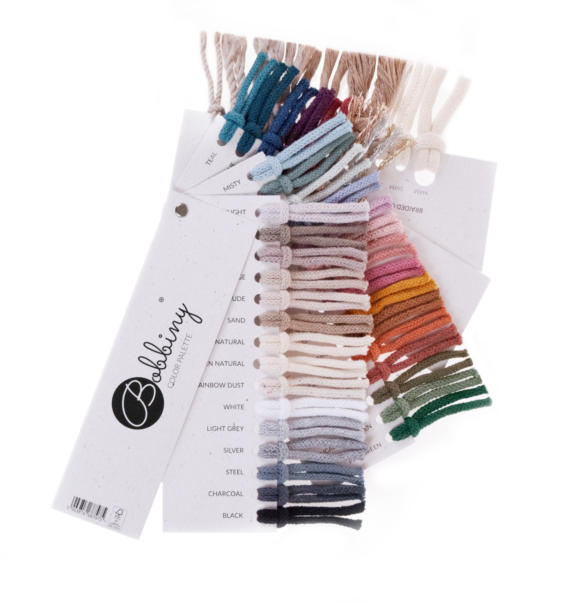 Mit dieser Farbkarte von Bobbiny sehen sie alle Farben auf einen Blick. Ausserdem gibt es eine Übersicht aller Garnarten und Stärken.