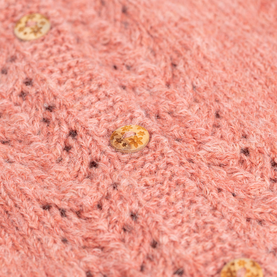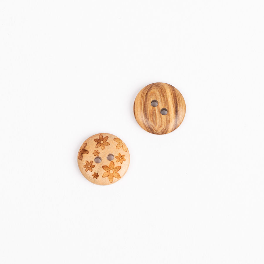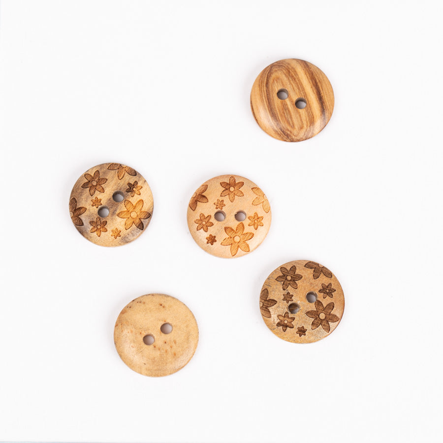 Dekorative Knöpfe mit eingraviertem Blumenmotiv aus Olivenholz.