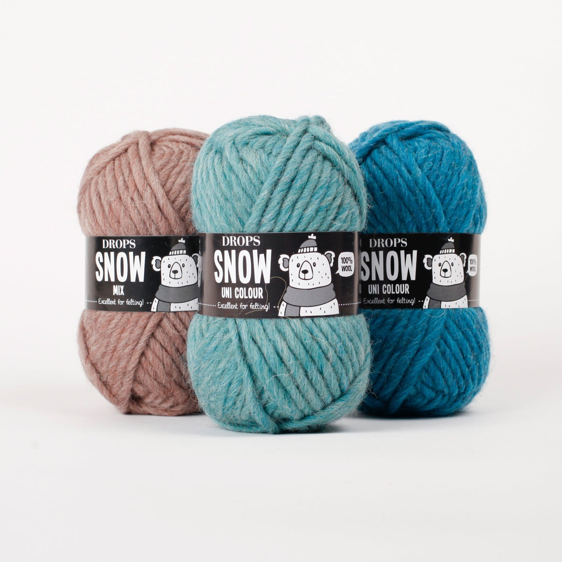 DROPS Snow ist ein sehr beliebtes Wintergarn, das in zwei verschiedenen Farbtypen erhältlich ist: einfarbig (uni) und als Mix-Farben, d.h. es werden mehrere Farben vor dem Spinnen zusammen kardiert, um einen Mischeffekt zu erzielen.